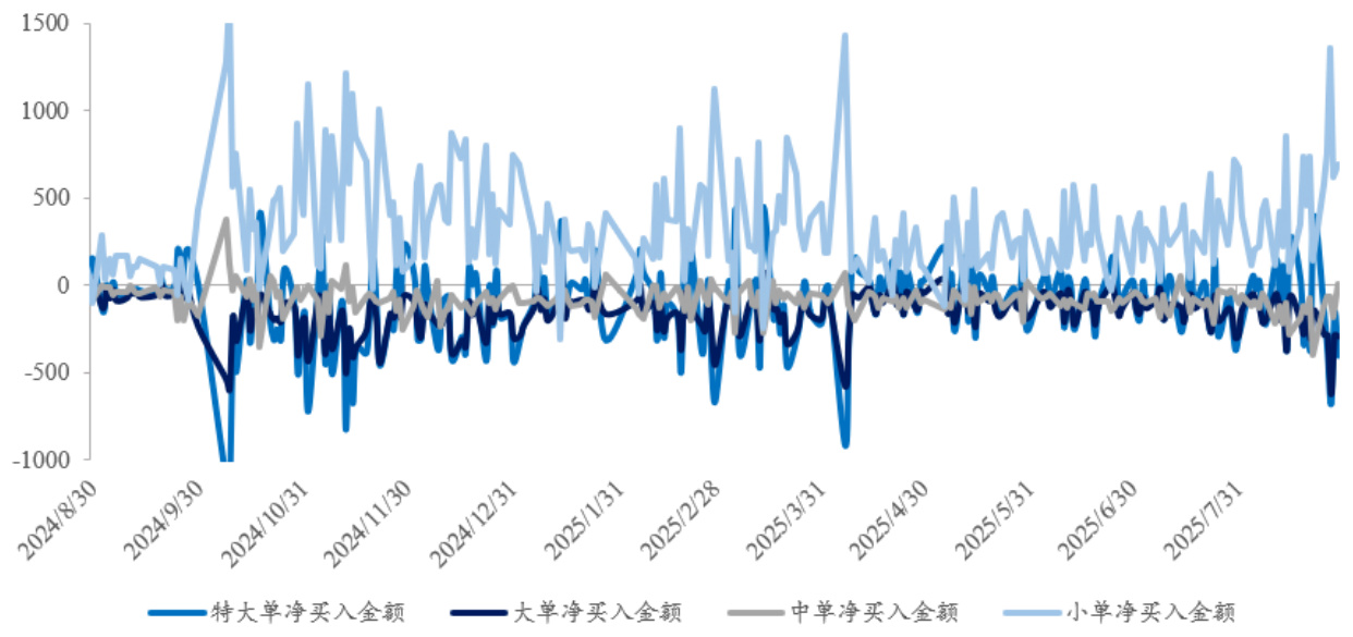 分析不同成交单规模资金净买入额,显示小单资金持续净流入,反映散户活跃;大单及特大单的资金流出,映射机构资金近期谨慎态度。[page::9]