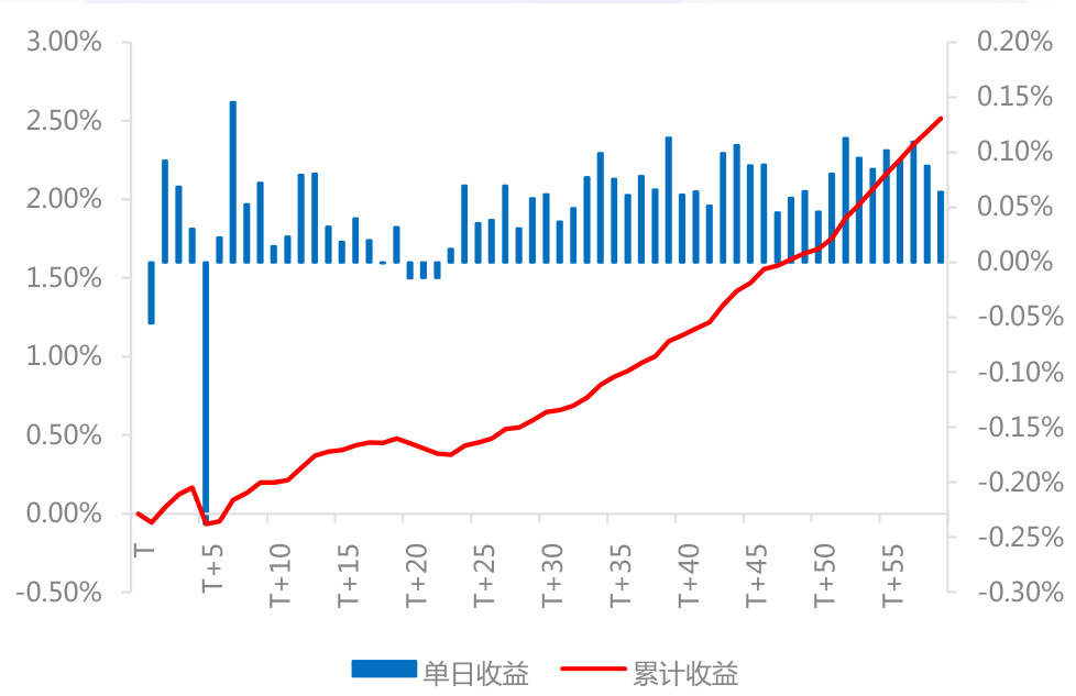 - 以披露日为T日,假设在T+1日开盘价买入,持有60个交易日,初步显示此类股票存在显著超额收益(累计涨幅可达2.5%)。