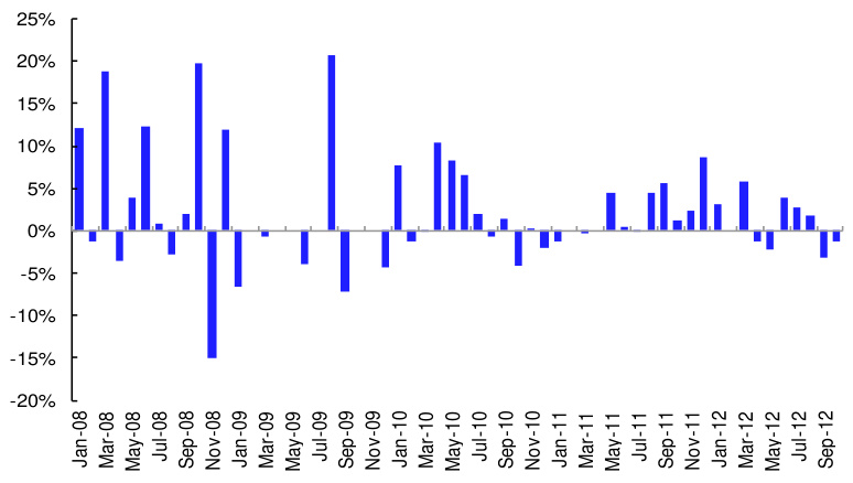- 图8显示月度收益波动,中间仍存在较大回撤,如2008年11月接近15%,无止损策略压力大[page::7-8]
