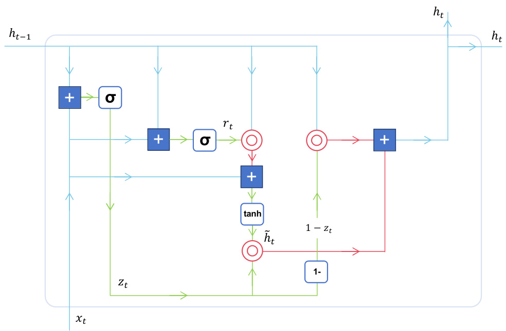 - 描述:展示GRU中三大门控机制——更新门 \(zt\),重置门 \(rt\),以及候选隐藏状态 \(\tilde{h}t\) 的计算流程及组合。