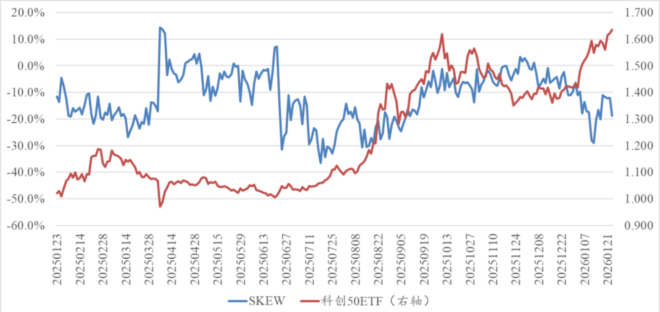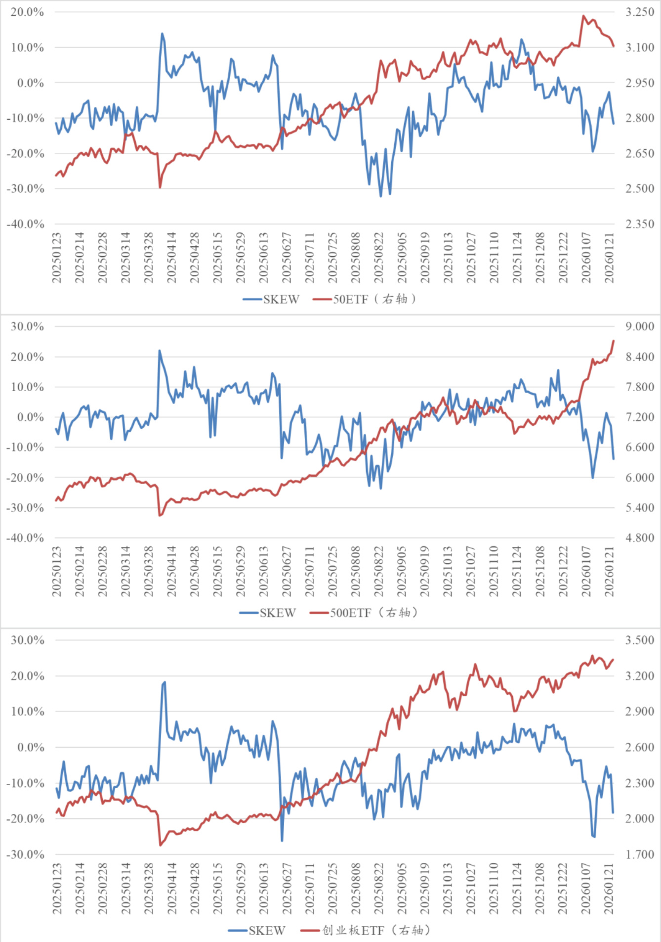 - 关键观察:本周 50ETF、500ETF、创业板ETF、科创50ETF 的 Skew 均维持负值且整体较上周有所下降,显示市场情绪趋于乐观(即虚值认购相对更昂贵或认沽不那么贵)[page::0]。图表中 50ETF、500ETF 的 Skew 与标的价格常呈反向/复杂关系——例如在 2025 年下半年至 2026 年初,标的上行的阶段 Skew 有显著下降(负值加深),但也存在短期反弹的阶段[page::3]。
