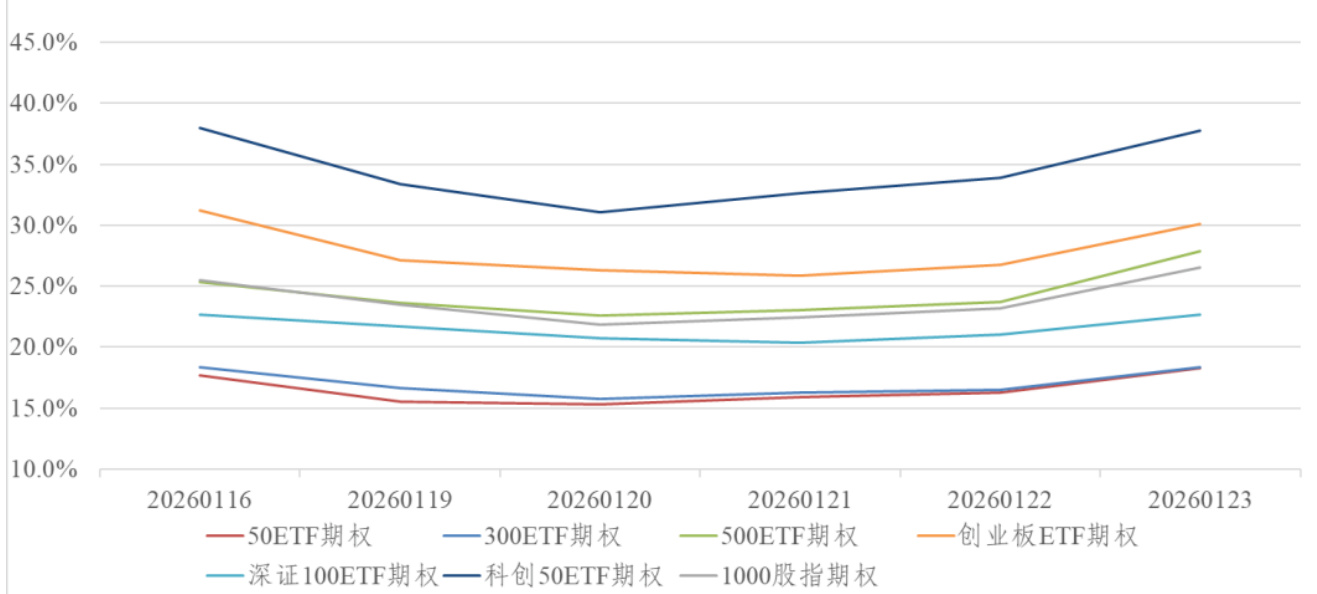 - 图形观察:图3(近几日IV 变化)与图4(近一年IV 变化)显示:短期内所有品种在 1 月下旬出现了 IV 回升,科创50 和创业板ETF 的IV 波动更高,300ETF(合并展示)位于较低区间[page::2]。作者注释称对类似品种已做合并展示(例如两只 300ETF 与 300股指期权)[page::2]。