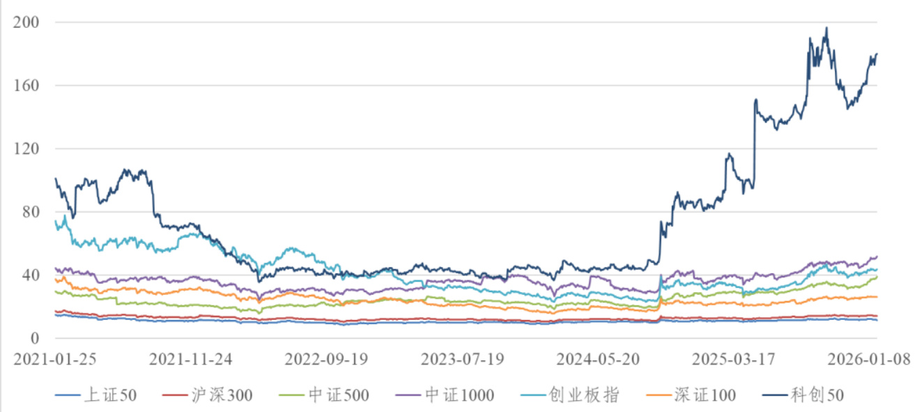 - 意义:高位估值对应可能更高的市场预期与波动敏感性,尤其是科创50 的极高分位暗示该板块对预期变化更为敏感,这与其期权隐含波动率长期偏高的观察相一致(后文 IV 图表将验证)[page::1]。