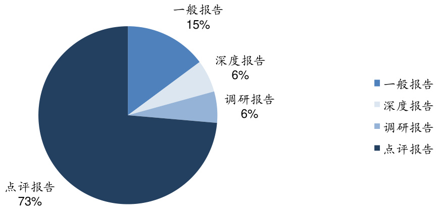 - 点评报告占比最高,达73%;一般个股15%;深度与调研报告各占6%。