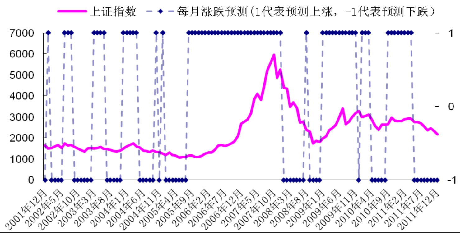 - 描述:图表纵轴左侧为上证指数实际点位,右侧为模型月度涨跌方向预测(+1代表预测上涨,-1代表预测下跌),横轴为2001年12月至2011年12月时间跨度。