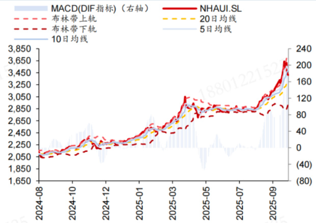 - 图表2显示南华黄金指数技术指标,MACD和布林带揭示阶段性震荡,价格仍站稳关键均线。
