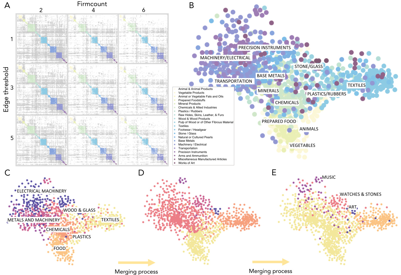 - 描述:图3A为 adjacency矩阵,显示行业内强连接,随着 firmcount 阈值提高,边变少但统计结构稳定。图3B为网络可视化散点图,着色代表HS产品大类。图3C-E展示多尺度社区合并过程,揭示三大产业群及纺织独立存在。