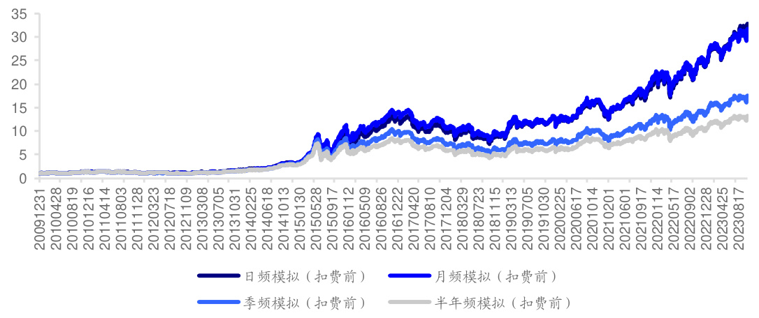- 调仓频率影响:从日频降至月频调仓,累计收益依然保持96%左右,说明较高调仓频率非收益放大主要因素;季频及以上频率显著降低表现。