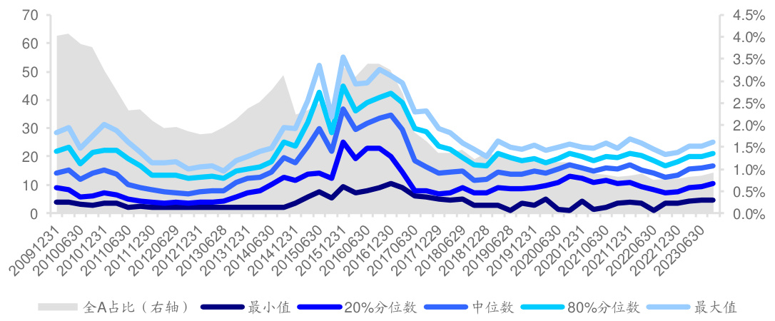 - 观察及数据:万得微盘股指数的市值中位数约14亿(远小于中证1000的64亿),该指数成分股市值持续位于A股低端,且成分股流通市值总和仅占全A的1%左右。图6体现流通市值分布与低占比的趋势。