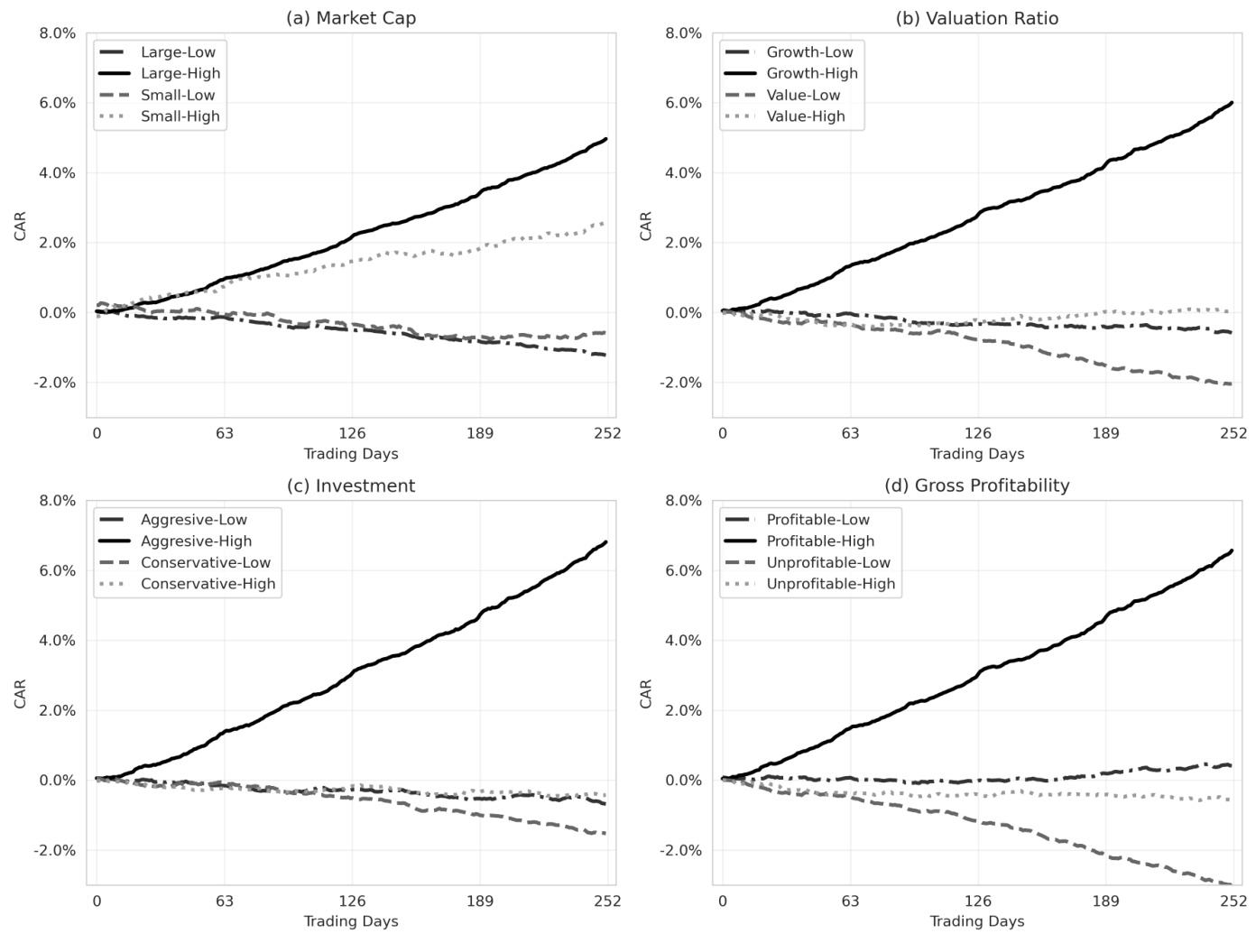 - 用每日基于文本预测的分组投资组合跟踪发现,最高预测组合累计异常收益率高达4.7%,最低组亏损达1.2%,高低组间收益差异为5.9%,回报分化随时间稳步扩大。